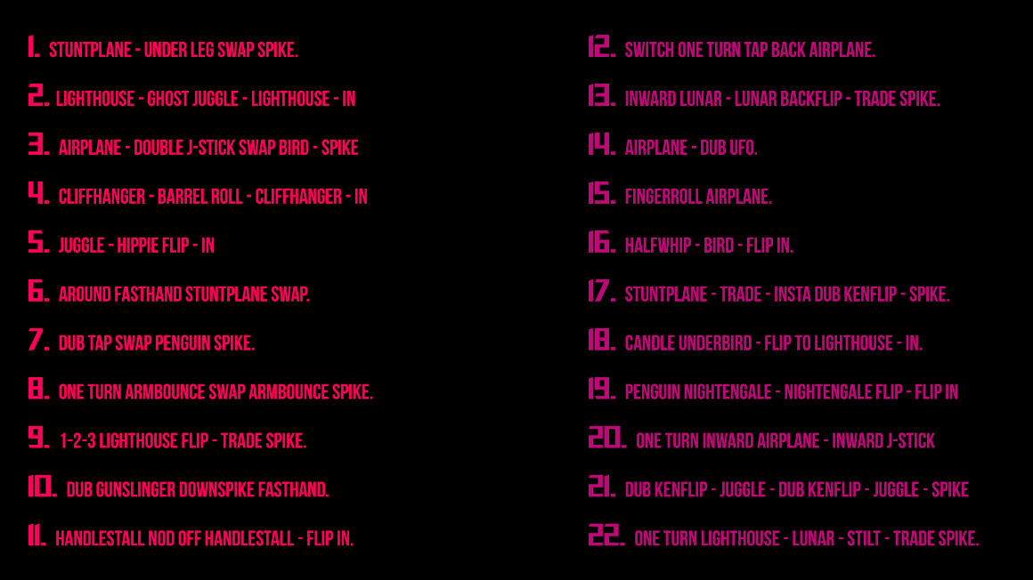 There will be 1 vs 1 on the stage. The trix will be drawn randomly from our 22 trick shown on the tricklist above. If you land the trick and your opponent don't you receive one point. First player to get 3 points move on to the next round. If all trick are drawn and noone has 3 points the leader moves on. If there is a draw there will be sudden death.